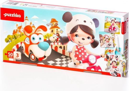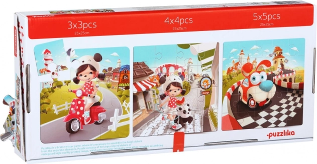 Puzzlika Šťastné příběhy 3 v 1 je skvělé zábavné puzzle navržené speciálně pro malé děti. Každý set obsahuje 50 pevných a odolných dílků, z nichž lze poskládat tři samostatné obrázky o rozměru 25 x 25 cm. Každý obrázek má jiný počet dílků: 3x3, 4x4 a 5x5. Výroba puzzle využívá kvalitní vícevrstvý karton s lesklým povrchem, z ekologicky pěstovaného dřeva. Puzzle je možné snadno čistit vlhkým hadříkem.