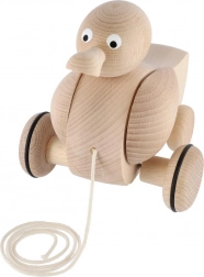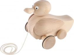 Tato klasická tahací hračka je vyrobena z přírodního dřeva a navržena pro bezpečné a zábavné hraní. Kačer se při jízdě roztomile pohybuje a hýbe hlavou, čímž děti podněcuje k dalším krokům a objevování. Vyniká pevnou konstrukcí a hladkými hranami pro pohodlné uchopení malými ručkami.