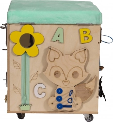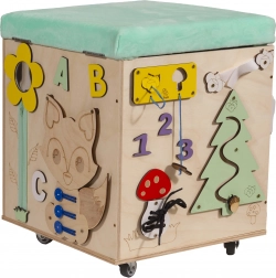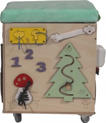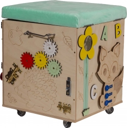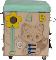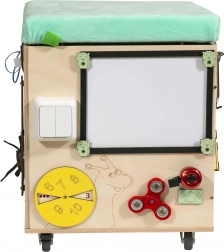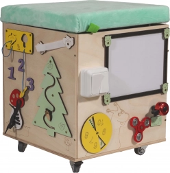 Kolečka umožňují puf snadno přesouvat. Strany kostky nabízejí různé aktivity včetně suchostíratelné tabule, zrcátka a vypínače světla.