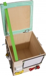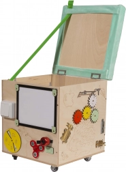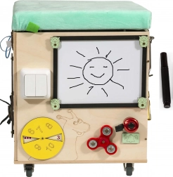Po stranách kostky najdete interaktivní prvky, které podporují rozvoj jemné motoriky, koordinace oko–ruka i logického myšlení: ozubená kolečka, zvonek, fidget spinner, zipy, přezky, suchý zip, háčky, západky, provlékání tkaničky, zrcátko, vypínač světla a také suchostíratelnou tabuli pro kreslení a psaní.