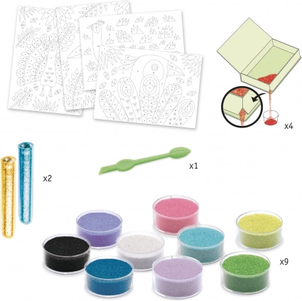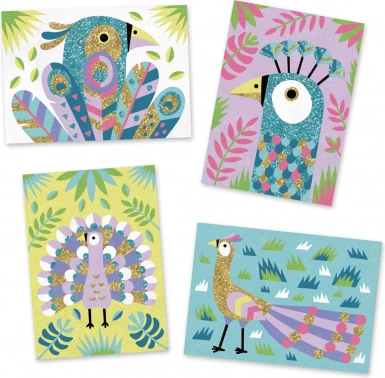 Kreativní sada DJECO na pískování: oslniví ptáci s barevným pískem a flitry. Snadný postup, rozvoj motoriky a fantazie. Ideální pro děti od 4 let.
