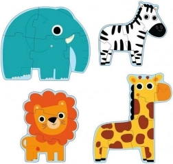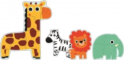 Objevte zábavná obrysová puzzle s motivy lva, zebry, slona a žirafy, ideální pro první skládání. Sada obsahuje čtyři puzzle o různé obtížnosti (3, 4, 5 a 6 dílků) a podporuje jemnou motoriku, logické myšlení a koordinaci oko–ruka. Skvělá volba pro děti od 2 let.