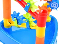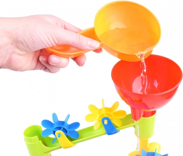 Nalijte vodu přímo do horního trychtýře – proud poteče po dráhách a roztočí všechny barevné mlýnky.