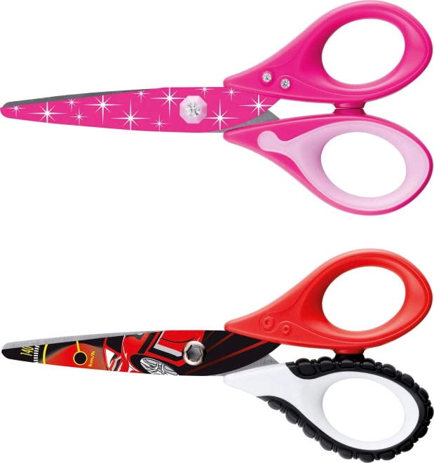 Nůžky mají zaoblené špičky pro vyšší bezpečnost a ergonomicky tvarované rukojeti. Varianta Boy zaujme texturou připomínající pneumatiku, varianta Girly pak ozdobnými štrasovými kamínky. Ilustrační foto – barevnost a motiv jsou dodávány náhodně podle aktuálních zásob.