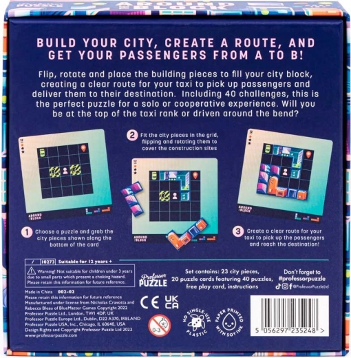Vstupte do světa logického myšlení s touto fascinující hrou od Professor Puzzle. Rozmístěte dřevěné dílky, představující budovy města, tak, aby taxi dokázalo vyzvednout cestující a dojet s nimi až do jejich destinace.