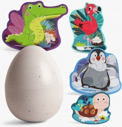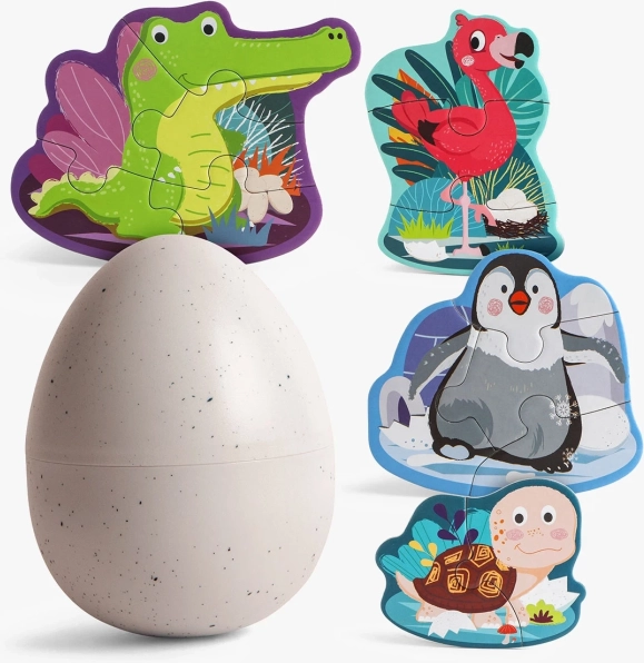 Každý obrázek má zezadu shodný potisk a dílky jsou očíslované, takže děti rychle pochopí, co kam patří. Vše se ukládá do pevného plastového vejce, které se lehce otevírá a udržuje pořádek doma i na cestách.