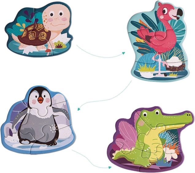 Čtyři puzzle s postupným navýšením dílků podporují sebevědomí dětí a učí je skládat krok za krokem.