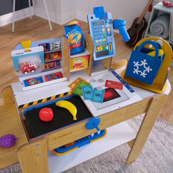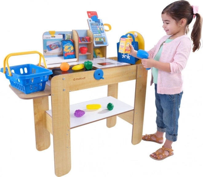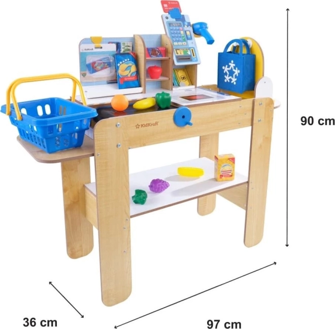 Dopřejte dětem realistickou hru na obchod s dřevěnou samoobslužnou pokladnou KIDKRAFT. Součástí je pohyblivý pokladní pás, ruční skener se světly a zvuky, 30 doplňků včetně potravin, košíku, tašky a karty. Hra rozvíjí peněžní gramotnost, představivost i sociální dovednosti a díky pevné dřevěné konstrukci vydrží roky zábavy.