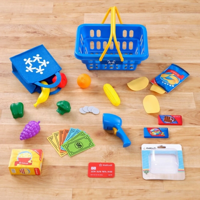 - 30 dílů: potraviny na hraní, košík, taška, kreditní karta, papírové bankovky a plastové mince