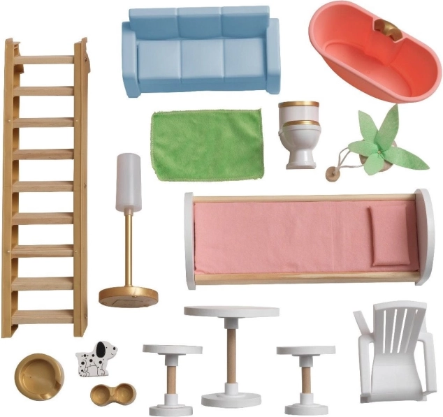 Součástí balení je 15 kusů barevného nábytku a příslušenství, takže si děti mohou ihned zařídit každý pokoj podle svých představ. Kvalitní kombinace dřeva a odolných plastů zaručuje dlouhou životnost a bezpečné hraní od 3 let.
