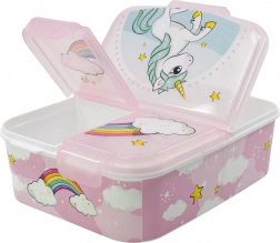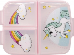Stylový multi box na svačinu s veselým motivem jednorožce a duhy pomůže dětem udržet jídlo přehledně oddělené a čerstvé. Tři samostatné přihrádky jsou ideální pro ovoce a zeleninu, sendvič i malé pamlsky. Pevná konstrukce odolá běžným pádům a nárazům, takže je box skvělou volbou pro každodenní použití.