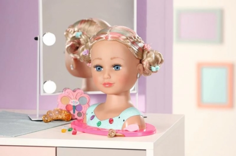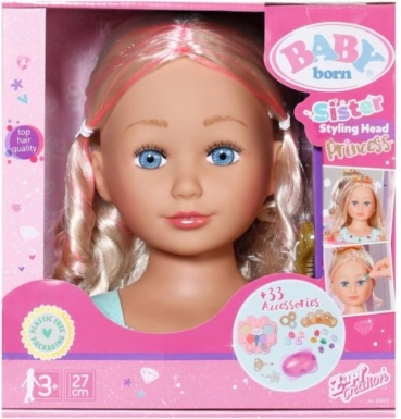 Proměňte každé odpoledne v pohádkový salon krásy. Česací hlava BABY born sestřička s kvalitními blond vlasy se snadno upravuje do vln, copánků, culíků i elegantních drdolů. Díky bohaté sadě doplňků a bezpečnému líčení děti vytvoří nespočet stylů od princeznovských po moderní.
