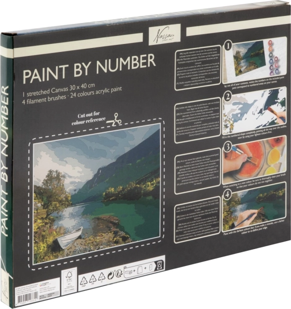 V balení najdete napnuté plátno 30 × 40 cm s předtištěnými čísly, 24 akrylových barev a 4 štětce (2 ploché, 2 kulaté) – bez nutnosti dalšího dokupování.