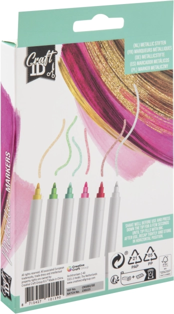 Metalické fixy Craft přinášejí výrazný lesk a profesionální efekt na papíře i dalších površích. Snadno s nimi vykreslíte jemné linky i vybarvíte větší plochy bez šmouh. Díky sytým pigmentům jsou barvy viditelné a atraktivní i na tmavých podkladech.