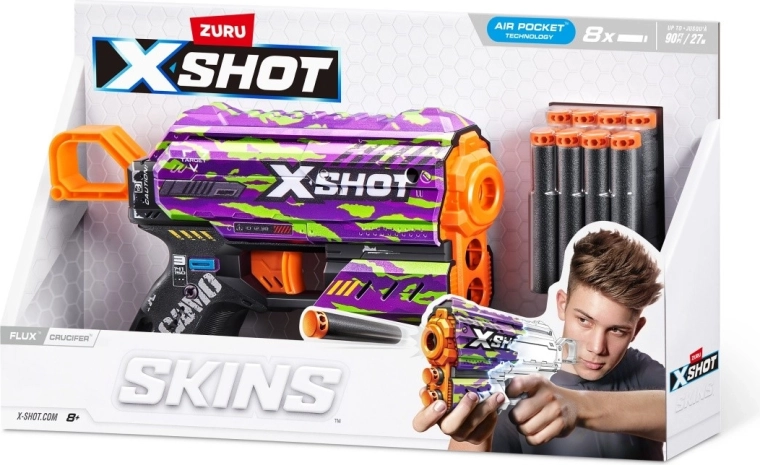 Vystup z davu s personalizovaným vzhledem SKINS a vyzvi kamarády k přestřelce s lehkým, ale výkonným blasterem X-Shot Skins Flux. Díky technologii Air Pocket v šipkách získáš stabilní let a lepší přesnost, zatímco kompaktní tělo pistole je ideální pro rychlý pohyb v interiéru i venku.