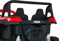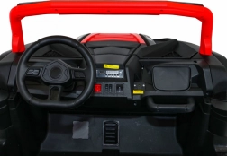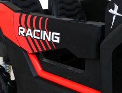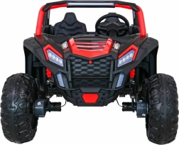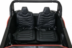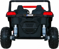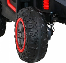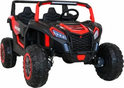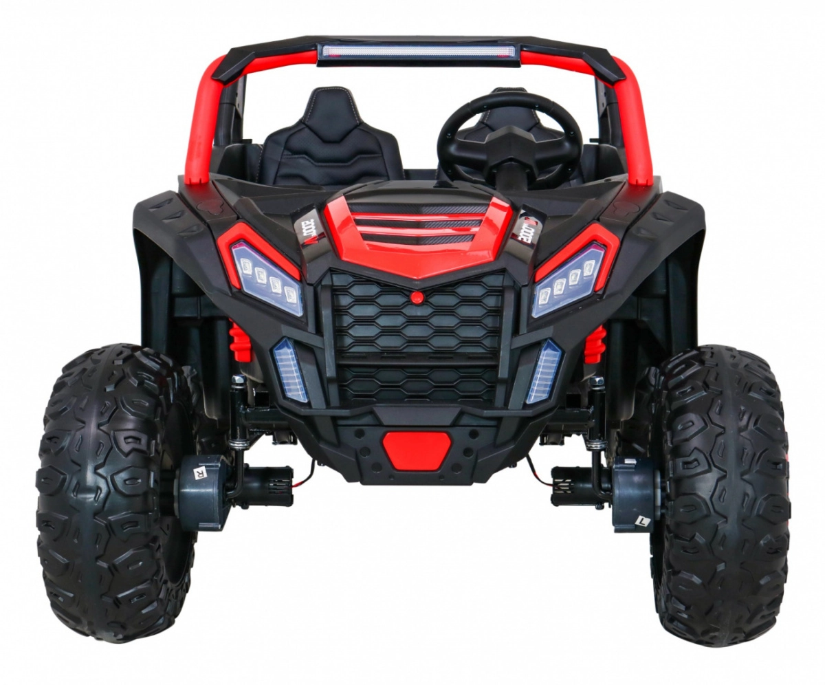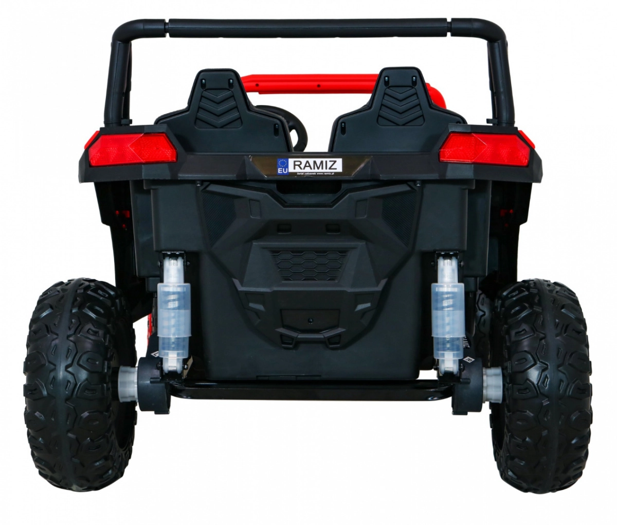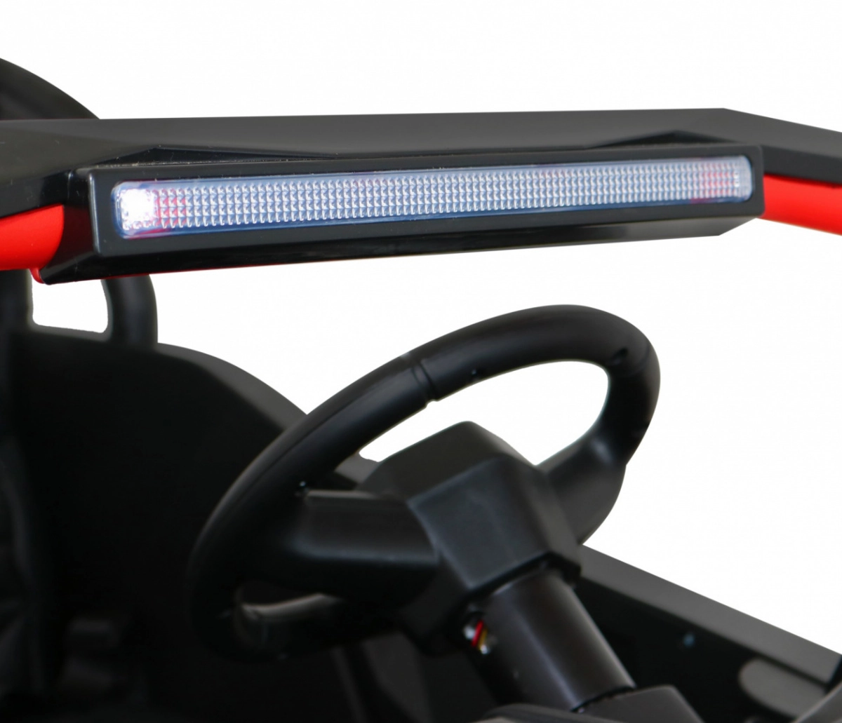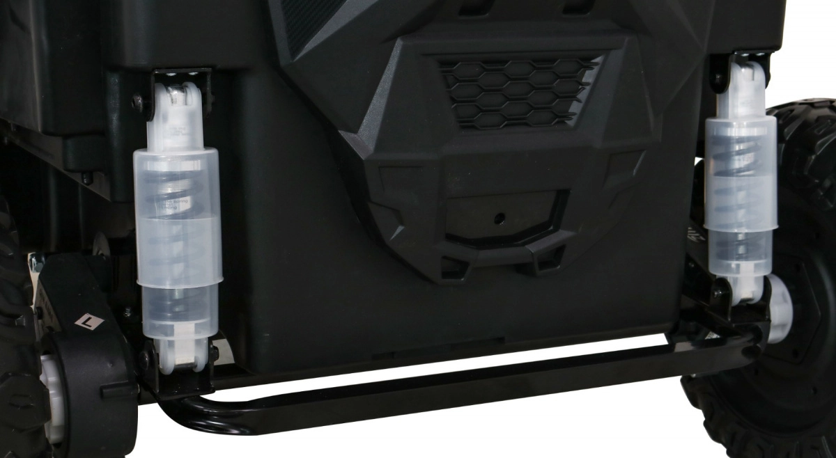 Terénní buggy pro dva malé řidiče kombinuje vysoký výkon, pohodlí a bezpečnost. Čtyři motory 200 W zajišťují jistý záběr všech kol, plynulý start chrání děti před trhnutím a dvojice zadních tlumičů zvyšuje komfort na nerovnostech. Velká EVA pěnová kola 35×15 cm nehučí a dobře tlumí, zatímco LED světla vpředu i vzadu zlepšují viditelnost.