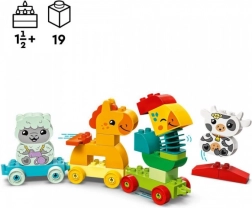 LEGO DUPLO zvířecí vláček potěší všechny malé milovníky zvířat a vozidel. Děti postaví kohouta, koně, ovečku a kravičku, posadí je do barevně sladěných vagónků a vydají se na dobrodružnou jízdu. Díky velkým kostkám se set snadno skládá a podporuje učení hrou.