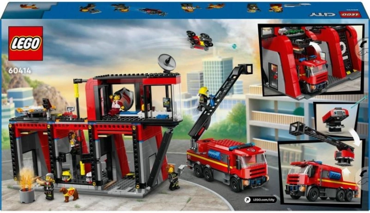 - Akční hasičská stanice – moderní zázemí, přistávací plocha, tyč pro skluz minifigurek, kuchyňka a odpočinkové zóny.