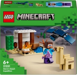 Pustinná výprava Stevea je jedinečný stavební set pro fanoušky hry Minecraft, určený pro děti od šesti let. Obsahuje tři figurky LEGO Minecraft včetně Stevea a domek v pouštním biomu. Set obsahuje ikonické prvky z hry, jako je stůl dílny, táborový oheň a různé pouštní scény.