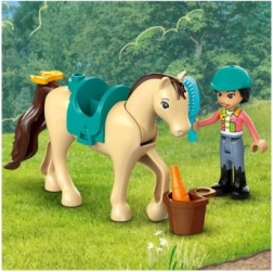 Tento barevný set je ideální pro malé stavitele od 4 let. Díky Startovací kostce je stavění rychlé a snadné, takže si děti brzy užijí hraní s tažným autem a přívěsem, dvěma minipanenky a dvěma koňmi. V lese čeká padlý strom jako skoková překážka a bohatá výbava pro péči o koně.