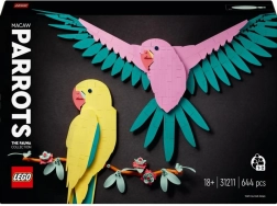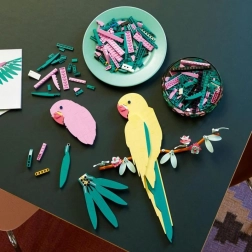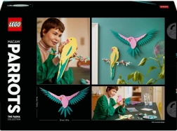 Vytvořte si vlastní designový obraz z kostek: jeden papoušek v zářivě žlutých tónech sedí na větvi zdobené květy, druhý růžový letí s rozevřenými křídly. Díky dvěma návodům můžete stavět společně a užít si pohodové chvíle plné kreativity.