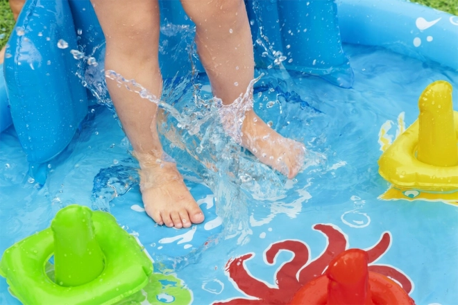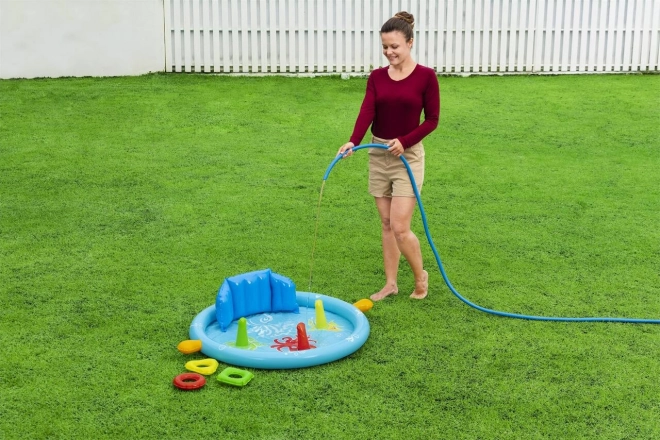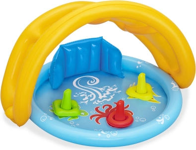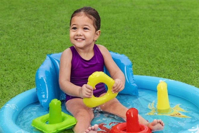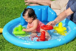 Součástí je barevná házecí hra s kroužky, která podporuje rozvoj jemné motoriky a koordinaci oko–ruka. Lehká konstrukce, 3 samostatné vzduchové komory a odolné ventily zaručují snadnou manipulaci i údržbu. Doporučené naplnění vodou je 31 litrů, což je pro malé děti ideální.