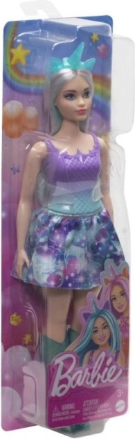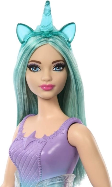 Barbie jednorožec s fialovo‑turkusovým outfitem, odnímatelnou čelenkou s rohem a třpytivými kozačkami. Kouzelná hra a styling pro děti od 3 let.