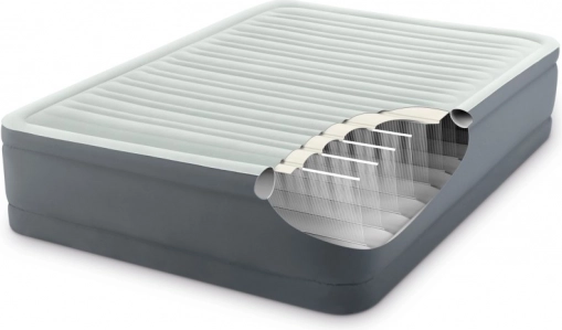 Nafukovací postel Intex PremAire I ve velikosti dvoulůžka (152 × 203 × 46 cm) je ideální volbou pro hostinský pokoj, chatu i dočasné spaní doma. Pokročilá konstrukce s technologií Fiber‑Tech a dvojitou výztuží stěn a dna zajišťuje vysokou stabilitu, odolnost a dlouhou životnost, zatímco sametový, žebrovaný povrch poskytuje pohodlí a lepší cirkulaci vzduchu.
