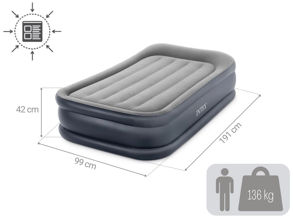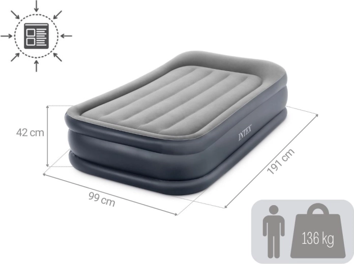 Jednolůžková nafukovací postel INTEX nabízí rozměry 191 × 99 × 42 cm, vestavěnou elektrickou pumpu pro rychlé nafouknutí, sametově velurový povrch pro pohodlí a odolnou konstrukci Fiber‑Tech / Dura‑Beam pro stabilní oporu. Maximální nosnost 136 kg, součástí je taška na přenášení a záplata.