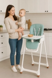 Výška sedáku, sklon opěradla i opěrka nohou se přizpůsobí věku a potřebám dítěte – od první lžičky až po samostatné stolování.