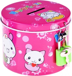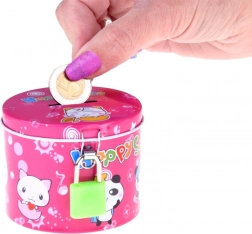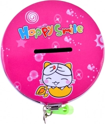 Růžový kovový povrch s veselými zvířecími motivy a nápisem Happy Smile zaujme děti a podpoří pozitivní návyky v hospodaření s penězi.