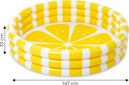 Rozkošný kruhový bazének s motivem citronu od značky INTEX přinese dětem od 2 let spoustu letní zábavy na zahradě. Díky velkému průměru 147 cm, výšce 33 cm a třem nafukovacím prstencům je stabilní, pohodlný a bezpečný. Odolný PVC materiál (0,18/0,20 mm) a kapacita 330 l zajistí osvěžení i v horkých dnech.