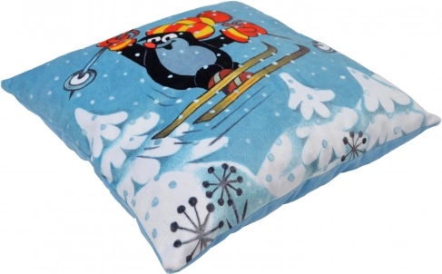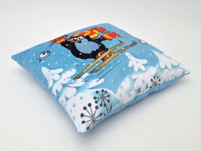 Měkoučký polštář Krtek s motivem lyžaře 30x30 cm. Univerzální použití: do postýlky, na cesty, jako dekorace.