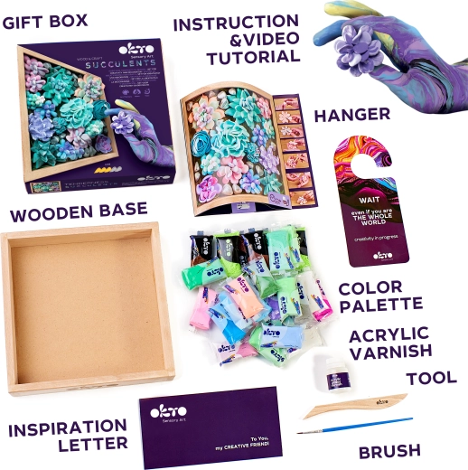 Kreativní sada pro milovníky tvoření i začátečníky. Vytvořte si realistické sukulenty ze samotvrdnoucí hmoty a vystavte je v elegantním dřevěném rámu 21 × 21 cm. Balení obsahuje vše potřebné – hmotu, tvarovací nástroj, štětec a obrázkový návod – stačí otevřít a začít tvořit.
