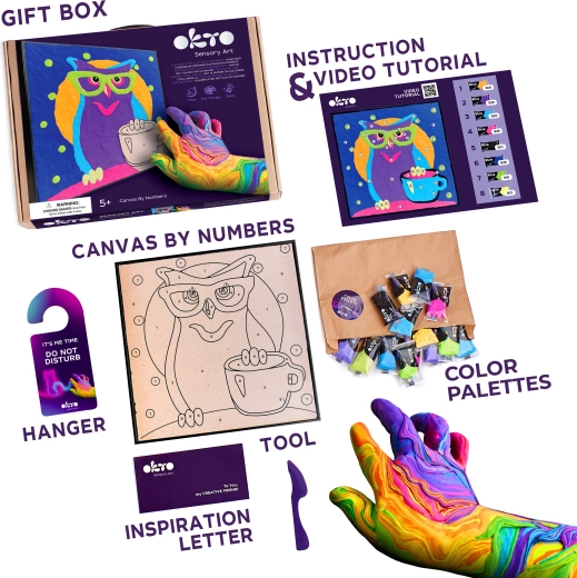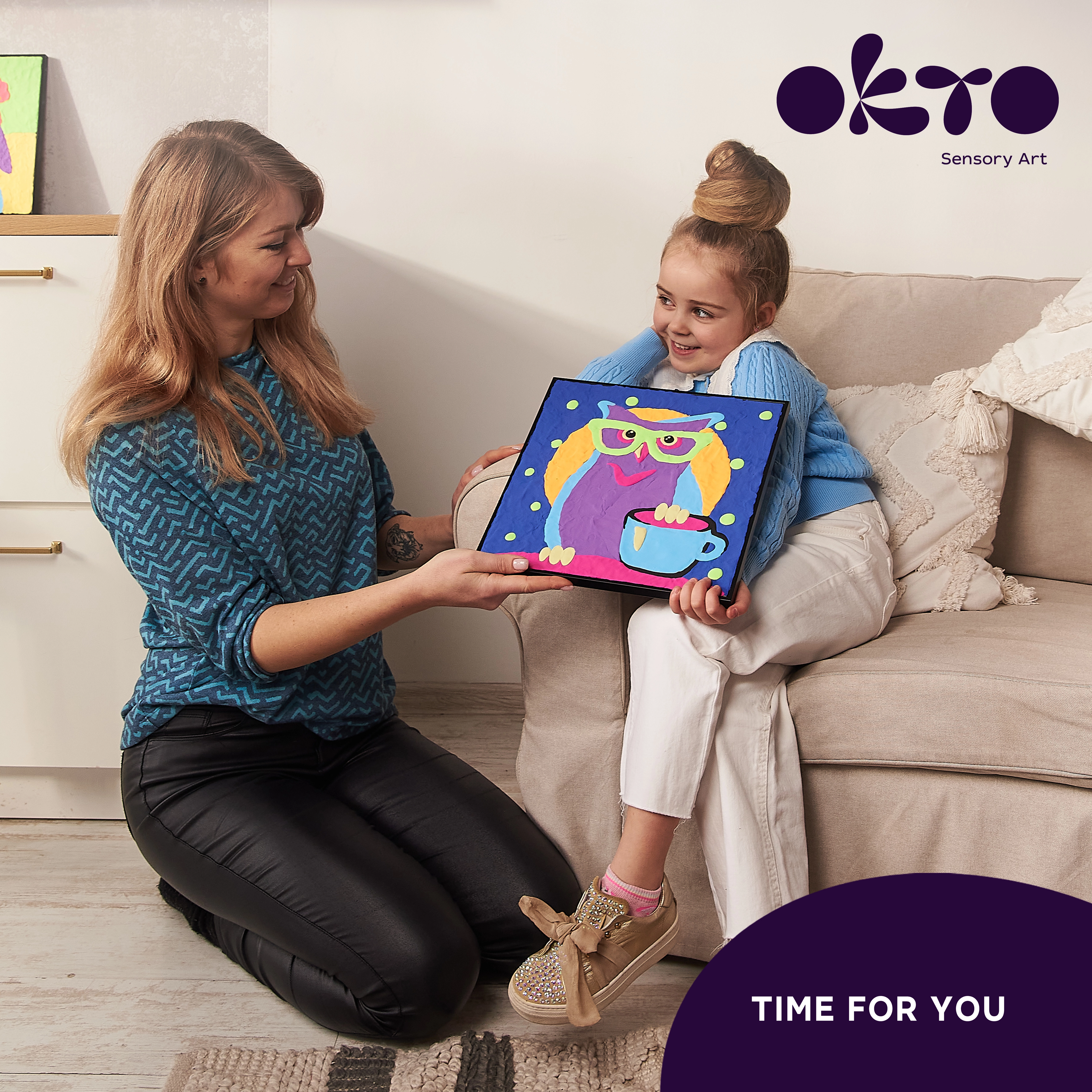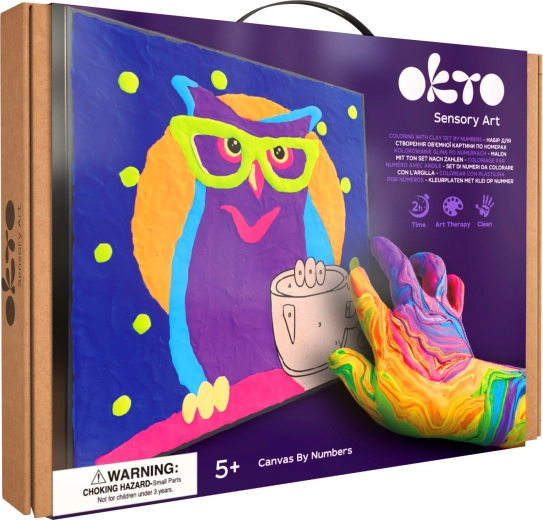 OKTO Sova výtvarná sada. Samotvrdnoucí hmota (air clay), malování prsty. Velikost plátna 29x29 cm. Obsah balení - plátno, obrázkový návod, tvarovací nástroje, samotvrdnoucí hmota.