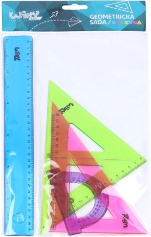 - Obsah sady: rovné pravítko 30 cm (modré), malý úhloměr (fialový), 2× trojúhelník (růžový a zelený)