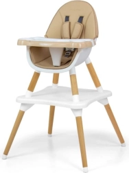 Židle se může přizpůsobit věku a výšce dítěte díky nastavitelným pěti bodovým bezpečnostním pásům. Taktéž je vybavena měkkými ramenovými průchodkami, které chrání před otěrem a tapecírka z ekokůže je odolná vůči znečištění. Podnos s důlkem zabraňuje sklouznutí předmětů.