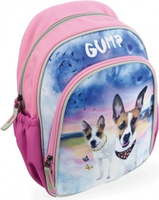 Batoh je vyzdoben barevným předním panelem s ilustracemi psů a nápisem 'GUMP', což z něj činí atraktivní doplněk.