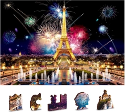 Puzzle je oboustranné (2v1): z jedné strany skládáte podle barevného motivu noční Paříže s ohňostrojem, z druhé podle opakujícího se vzoru jen podle tvarů dílků. Hladké hrany bez třísek zajišťuje precizní laserové zpracování a pevná HDF deska o síle 3–4 mm. V balení najdete také samostatnou předlohu pro pohodlnější skládání.