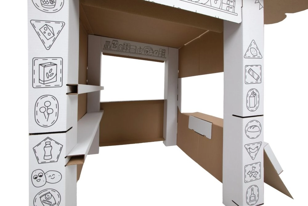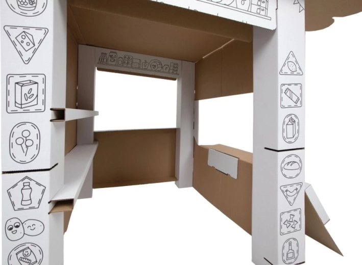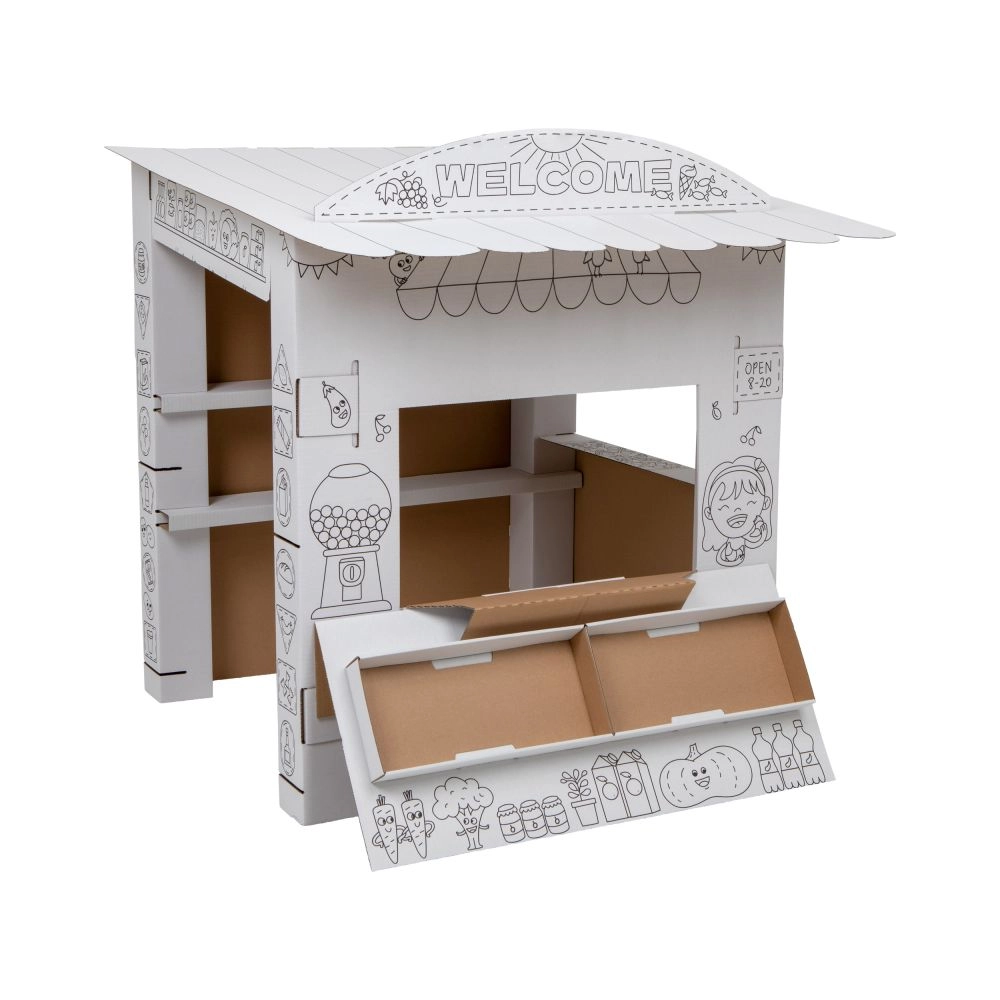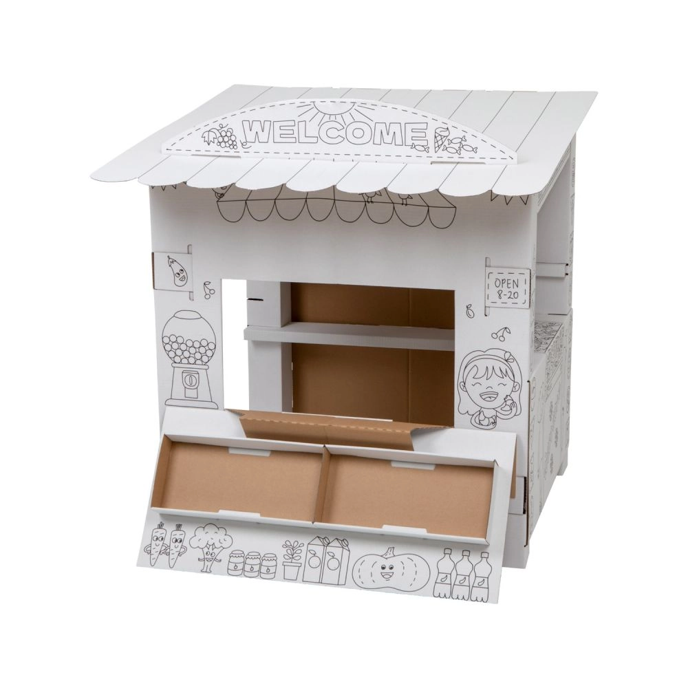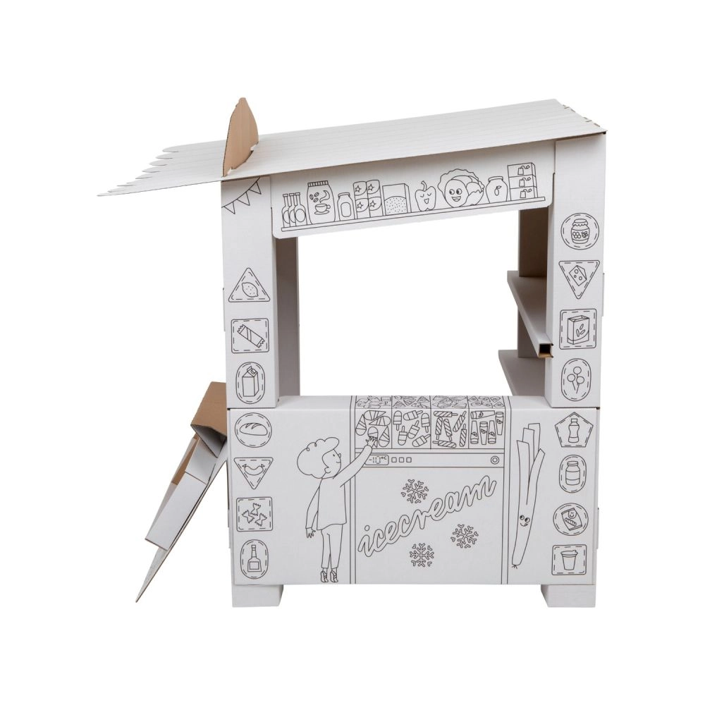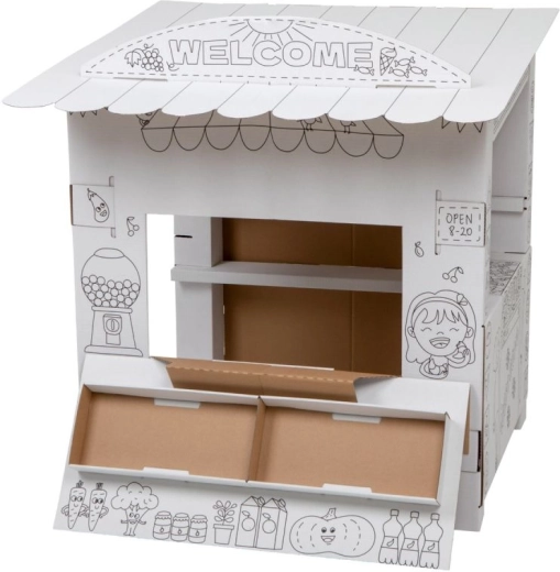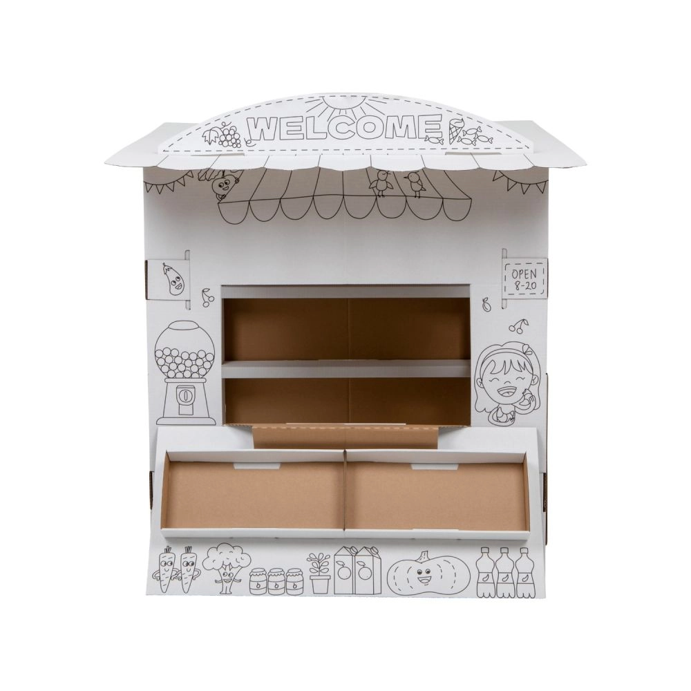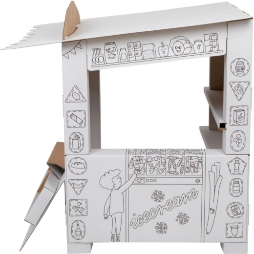 Tento kartonový stánek přináší dětem spoustu zábavy a učení v jednom. Díky černobílým obrysům jej mohou děti vybarvit pastelkami, fixami či voskovkami a vytvořit si tak vlastní originální prodejní stánek. Otevřený design se sklápěcím pultem a vnitřními policemi je jako stvořený pro hru na prodavače a zákazníka.
