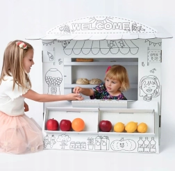 Tento stánek z kartonu umožňuje dětem hrát si na obchod a učit se základním sociálním dovednostem.