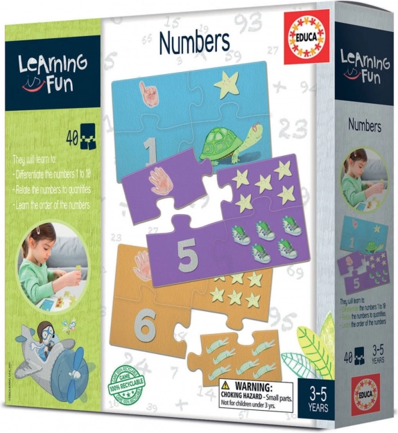 Objevte hravou cestu k matematice s řadou EDUCA Learning is Fun. Tato sada děti seznamuje s čísly 1–10, učí je první počítání a spojuje číslici, počet obrázků i prsty. Každému číslu odpovídají 4 dílky puzzle, které rozvíjejí jemnou motoriku, logické myšlení a trpělivost. Navíc je produkt 100% recyklovatelný.