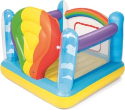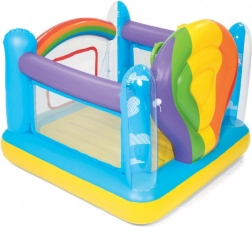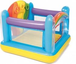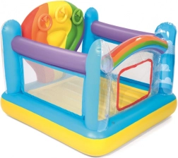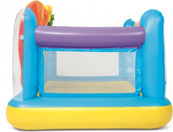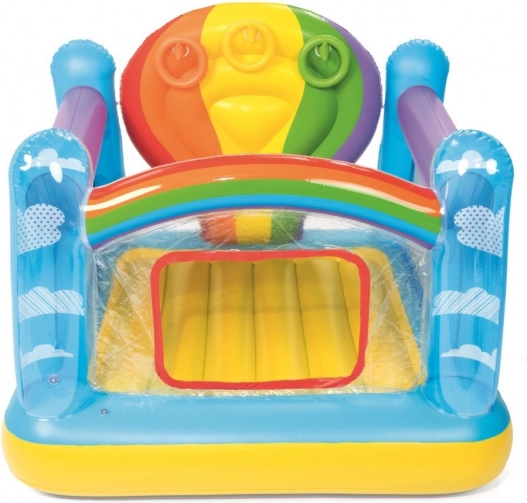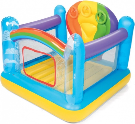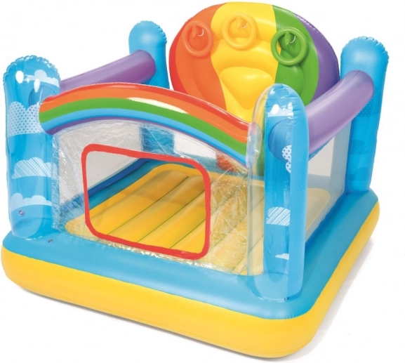 Barevné nafukovací hřiště BESTWAY nabízí dětem bezpečné místo pro skákání a hraní. Má pevné boční stěny, průhledné okénko pro snadný vstup a zábavné házení kroužků. Vyrobeno z odolného, testovaného vinylu se zabezpečovacími ventily a měkkou skákací podlahou.