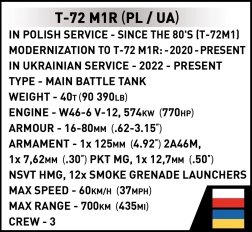 Stavebnice COBI věrně zachycuje modernizovaný tank T-72M1R používaný v Polsku a na Ukrajině. V měřítku 1:35 perfektně ladí s dalšími modely řady Armed Forces. Díky novému speciálnímu dílu pro charakteristická pojezdová kola, otočné věži, pohyblivému dělu i funkčním pásům si užijete jak stavbu, tak hraní a vystavení.