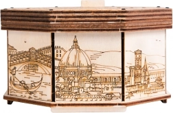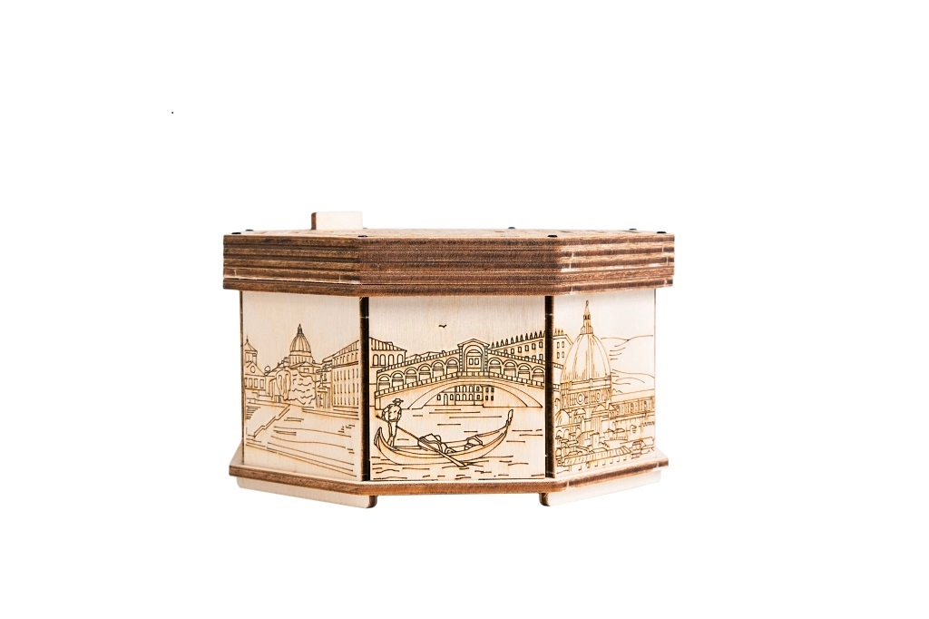Detailní gravury městských scenérií a hladký přírodní povrch dělají z krabičky stylový doplněk i dekoraci.