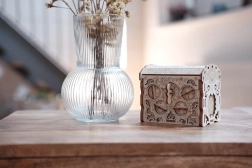Ornamentální výřezy a přírodní vzhled z něj dělají dekorativní krabičku, kterou si necháte vystavenou.