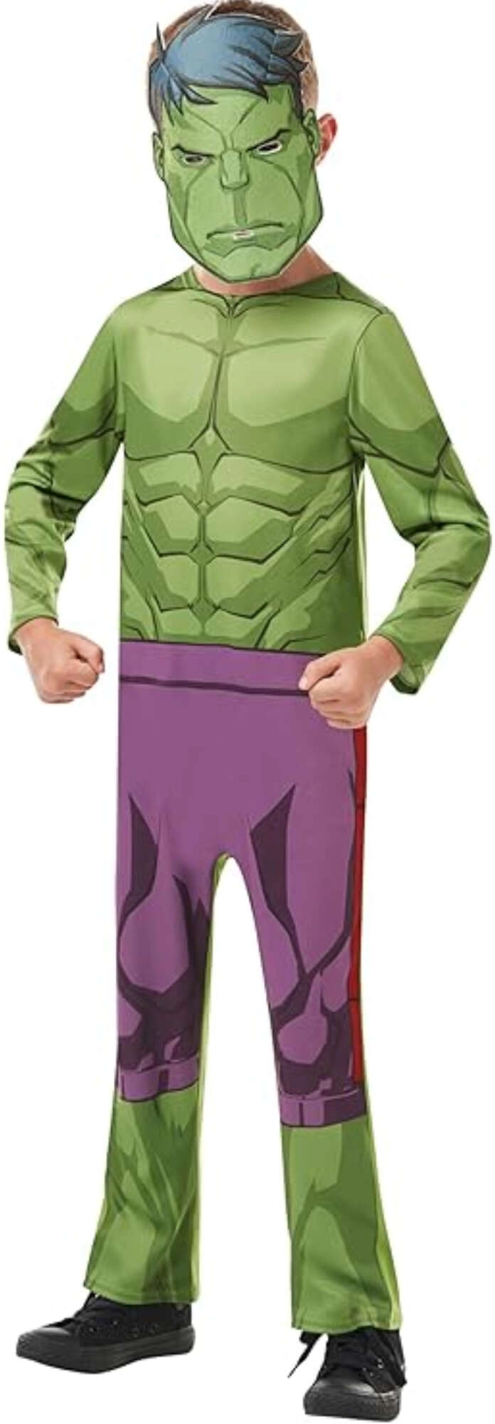 Tento dětský kostým HULK věrně napodobuje vzhled oblíbeného superhrdiny – zelené tělo s výraznou muskelaturou a typické fialové „kalhoty“ jsou vytištěny přímo na měkké látkové kombinéze. Součástí je i obličejová maska, která celý look dokonale sjednotí.
