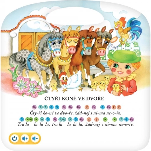 V knize najdete 12 oblíbených lidových písní včetně titulů jako: Komáři se ženili, Já jsem z Kutné Hory, Šel zahradník, Až já budu velká, Měla babka čtyři jabka, Okolo Třeboně, Na tom pražským mostě, Okolo Frýdku cestička, Čtyři koně ve dvoře, Vyletěla holubička, Šly panenky silnicí a Tluče bubeníček. Vše je nahráno ve zpívané i instrumentální verzi, takže si děti mohou zazpívat i jen tak zahrát melodii.