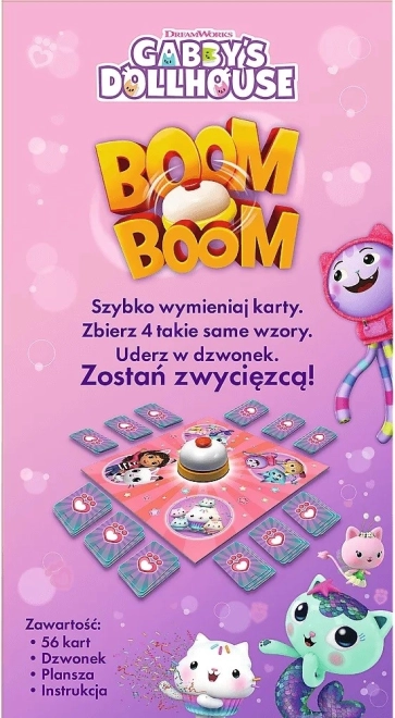 Boom Boom Kočičí Domek Gabi je hra, kde každý hráč hraje současně, snaží se získat 4 stejné karty a vyhrát. Hra přináší mnoho emocí a zábavy. Perfektní pro rodinnou zábavu nebo hraní s kamarády.