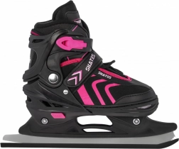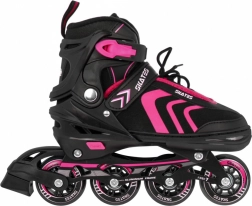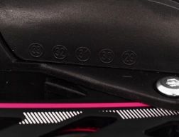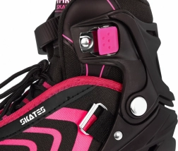 Pohodlí zajišťuje profilovaná vložka s měkkou pěnou EVA potaženou příjemným materiálem Velvet. Trojitý systém zapínání – tkaničky, pásek na suchý zip a bezpečnostní přezka – drží nohu pevně a spolehlivě. Hliníková podvozná část pro kolečka, PU kola 64×24 mm s tvrdostí 85A a ložiska ABEC 7 přinášejí hladkou a stabilní jízdu. Lední břity z nerezové oceli se snadno udržují a poskytují výborný skluz.